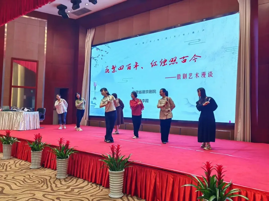 王李霞以“花繁四百年,红烛照古今”为题,讲解了徽剧艺术的历史、声腔、表演等特点,介绍徽剧艺术的发展演变史和为京剧形成发展、繁荣昌盛作出的贡献。讲授过程中,王李霞还结合两个折子戏代表作,作了戏曲表演技艺的示范讲解,并邀请参训老师上台参与戏曲中折扇的运用,让他们近距离感受戏曲艺术的美学规范和独特魅力。整场讲座生动有趣,参与性强,受到参训老师的欢迎。