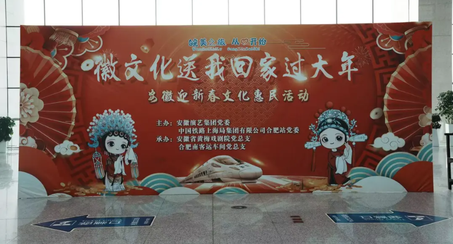 近日,“徽文化送我回家过大年——安徽演艺集团文艺小分队走基层专场演出”活动在合肥高铁南站候车大厅举办,为这个春节返乡路增添了别样的色彩。此次活动是由安徽演艺集团党委、中国铁路上海局集团有限公司合肥站党委主办,由安徽省黄梅戏剧院党总支、合肥南客运车间党总支承办。