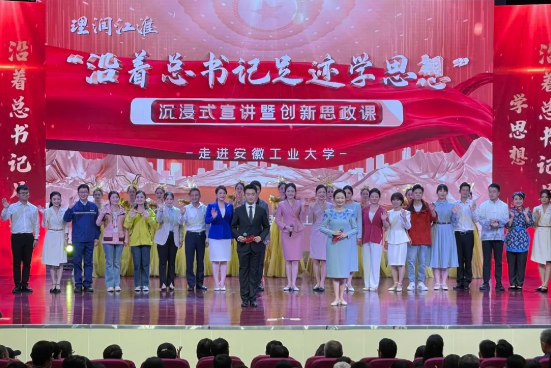 近日,由中共安徽省委宣传部、中共安徽省委教育工委、中共安徽省委讲师团主办,安徽省歌舞剧院协办的“理润江淮·沿着总书记足迹学思想”沉浸式宣讲暨创新思政课活动,在安徽工业大学、桐城师范高等专科学校、皖西学院、滁州学院、阜阳职业技术学院等五所高校接连开展。此次活动以艺术为桥梁,将贯彻落实习近平总书记考察安徽重要讲话精神的奋斗历程和显著成效,通过“艺术+宣讲”的创新形式生动呈现,为高校师生献上了一场场思想与艺术交融的精神盛宴。