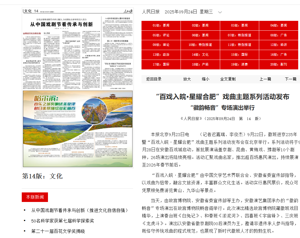 当天,由故宫博物院、安徽省委宣传部等主办,安徽演艺集团承办的“徽韵畅音”专场演出在故宫博物院畅音阁举行。此次演出精选故宫博物院藏徽班戏目精华,上演春台班《白兔记》、和春班《淤泥河》、四喜班《宇宙锋》、三庆班《龙虎斗》。演出以安徽省徽京剧院00后演员为主,邀请非遗传承人参与指导,既恪守传统戏曲的程式规范,也展现了新时代徽班人才的勃勃生机。(来源:《人民日报》2025年9月24日14版)